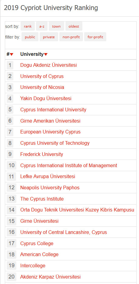 Rather than using data provided by universities, uniRank used valid and unbiased web metrics provided by independent web information sources to form a non-academic league table of the best Cypriot universities. EMU is at the top of the 2019 Cypriot University Rankings compiled according uniRank criteria. In the same rankings, EMU is followed by the University of Cyprus and the University of Nicosia from South Cyprus.